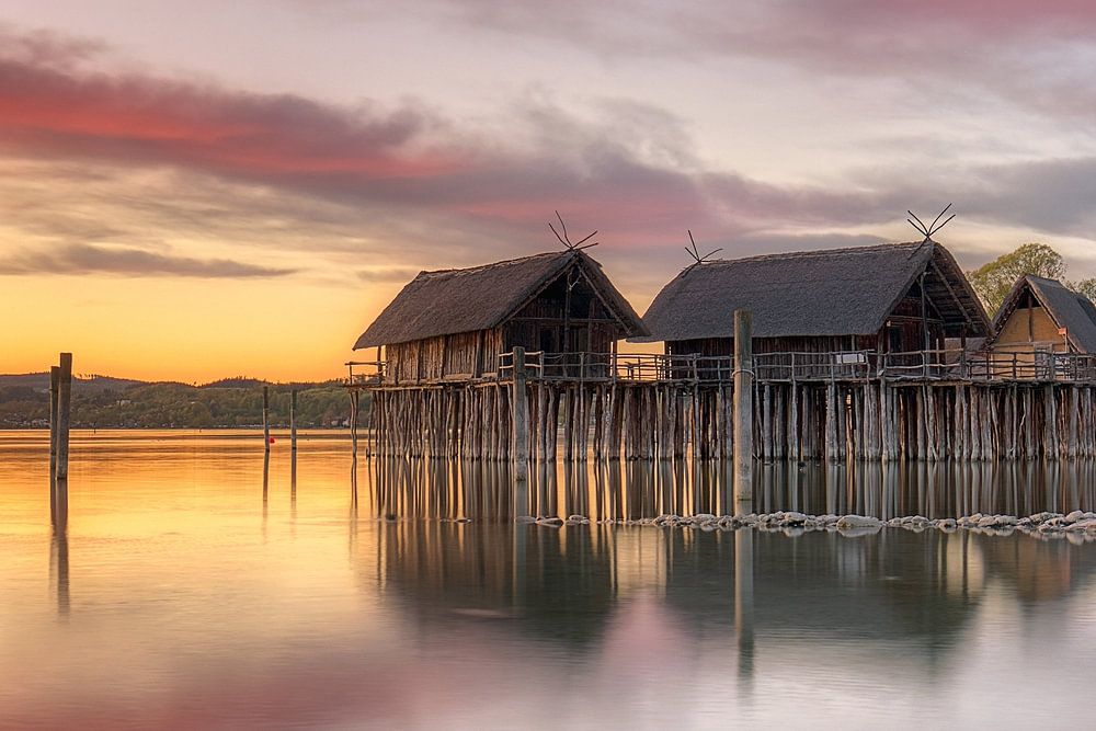 Sunset over the pile-dwelling museum on Lake Constance by Judith Kuhn