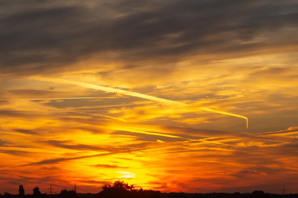 A beautifully coloured sunset with condensation trails of aircraft. What I especially like about this photo are the colours and the cloudy sky that is also still visible. I intentionally left the foreground very dark so that the sky stands out even more.