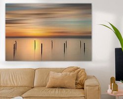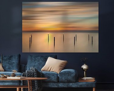Sunset in a small harbour on the IJsselmeer in Friesland. After the sailing season, all the boats have left and the mooring posts are left lonely.