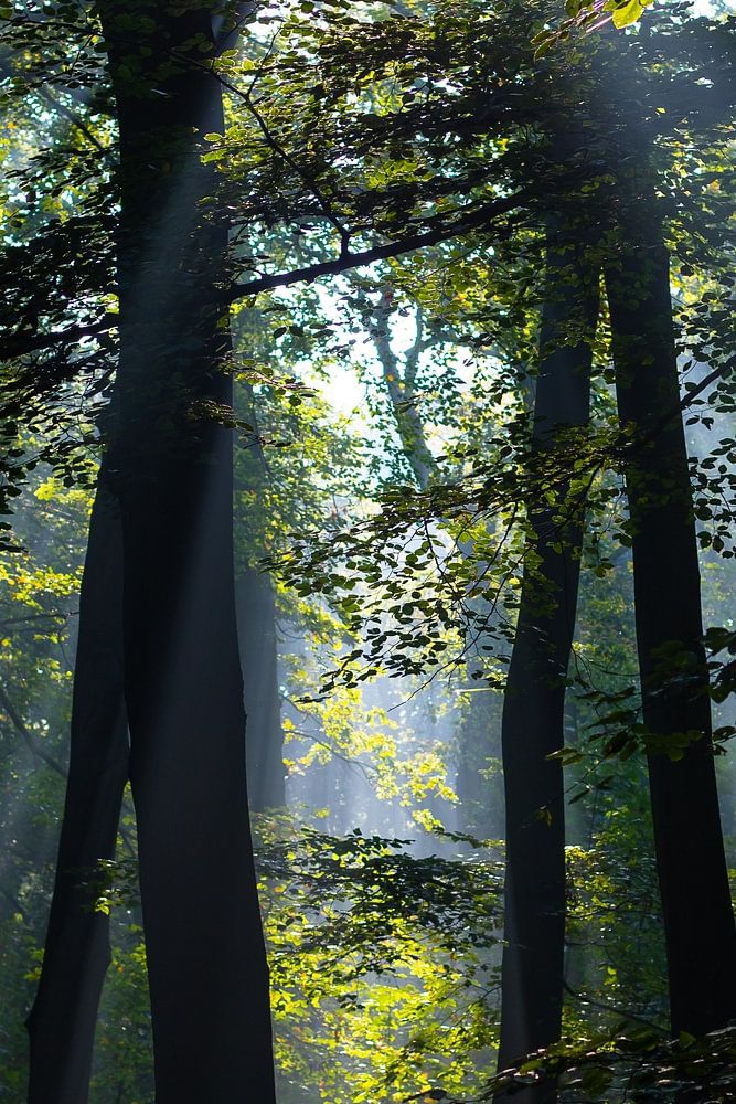 Sunshine through the trees. Magical dawn in the forest of The Hague.