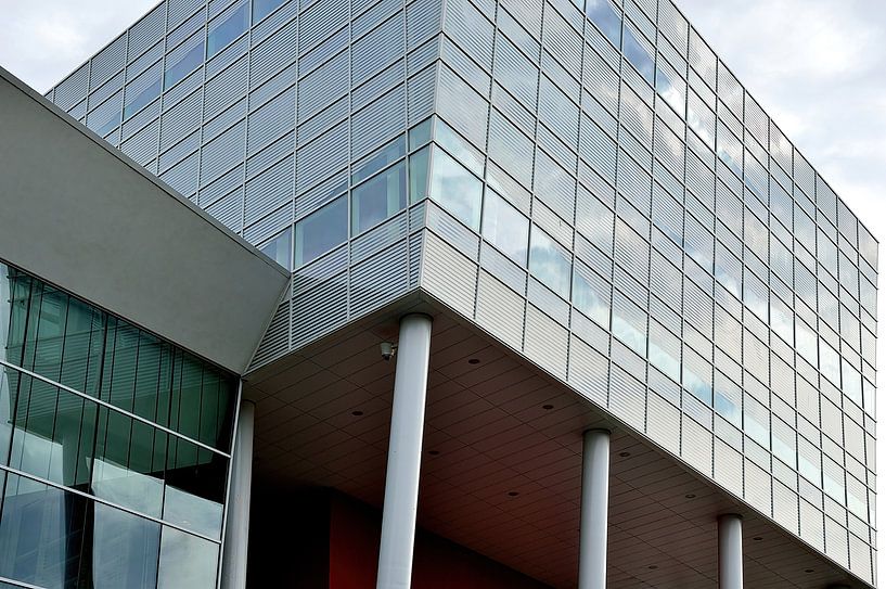 Part of the modern building that belongs to InHOLLAND in the city of Delft, the Netherlands. It is a small university with unique courses in the fields of biology, nature, environment and technology. I loved the sky that was being reflected in the windows and the pillars supporting the sky as such.