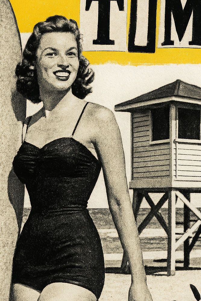 This retro-style summer collage takes you back to the iconic 1950s, featuring a smiling woman in swimming costume, a surfboard and a sunny beach scene. The combination of cut-out letters, yellow accent area and vintage textures gives it a playful and nostalgic feel.