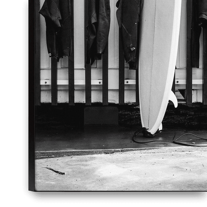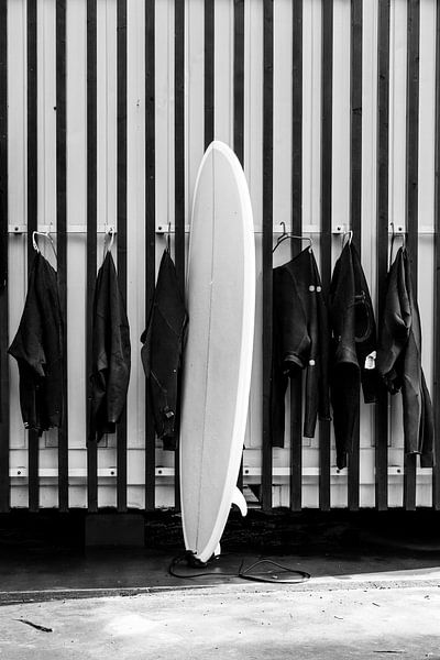 Surf vibes on your wall. Black and white travel photograph of a surfboard, taken on the island of Madeira in Portugal.