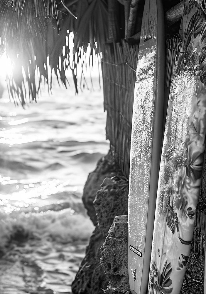 A secluded beach setting in the late afternoon with surfboards and gentle waves in the sunlight.