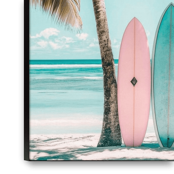 Tropical beauty unfolds beneath the gentle palm trees, where a colourful row of surfboards in soft pastel shades awaits on the snow-white sand. The glittering ocean in the background promises adventure and freedom, while the warm breeze spreads a feeling of holiday magic. A perfect moment to brave the waves!