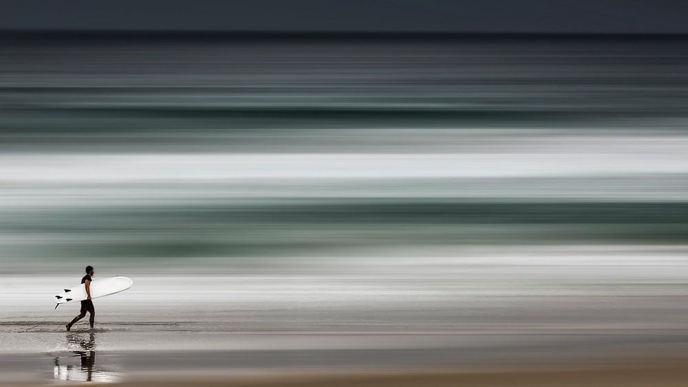 Australia on a rainy day, nobody on the beach except this surfer in the background the sky is black not very engaging but there is a soft and hushed atmosphere.