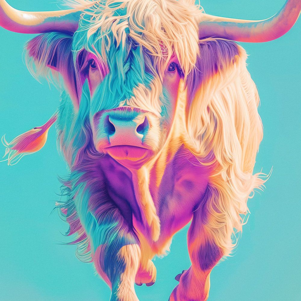 'Surreal Stride' is part of the 'Dreamveil Fauna' series, a collection of AI digital artworks created by Olaf Kramer, in which iconic animals - from majestic lions to surreal cows - float dreamily in explosions of colour, neon and pop art. Each image captures a moment of weightless imagination and invites wonder