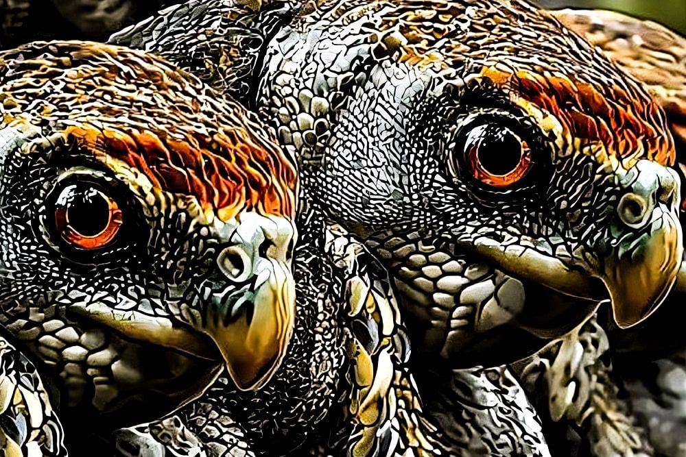 This unique artwork shows a surreal representation of three birds of prey with strikingly detailed feathers and intense gaze. The mix of rich textures and vibrant colours makes it a real eye-catcher. Perfect for lovers of modern and dynamic design, it brings an intriguing atmosphere to any room. Whether placed in a living room, hall or office, it instantly grabs attention and adds a touch of mystery and power to the interior. This artwork combines abstract and realistic elements, making it a fascinating piece for decoration.