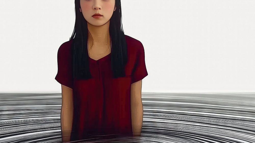 This surreal illustration shows a young Asian woman sinking into a vortex of swirling black and white lines. Her posture and the expression on her face reflect a deep, inner despair associated with the depiction of her struggle with mental health issues. The vortex that surrounds her symbolises the intense struggle and overwhelming thoughts that accompany her in her daily life. The contrasting black and white tones reinforce the feeling of being torn and lost, with the lines acting as an unstoppable undertow pulling her into an abyss of melancholy. Her facial features show the pain and burden of her thoughts, which, like the whirlpool itself, appear chaotic and uncontrollable. The surreal composition emphasises the sense of isolation experienced by many people struggling with mental distress and encourages reflection on the invisible but often debilitating challenges of mental health. This powerful depiction highlights the complexity and intensity of the inner conflict that accompanies depression and melancholy.