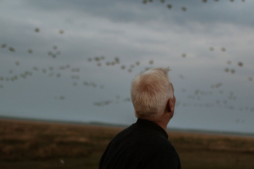 Man looks up at flying swallows. Photo taken at sunset in Schiermonnikoog, Netherlands