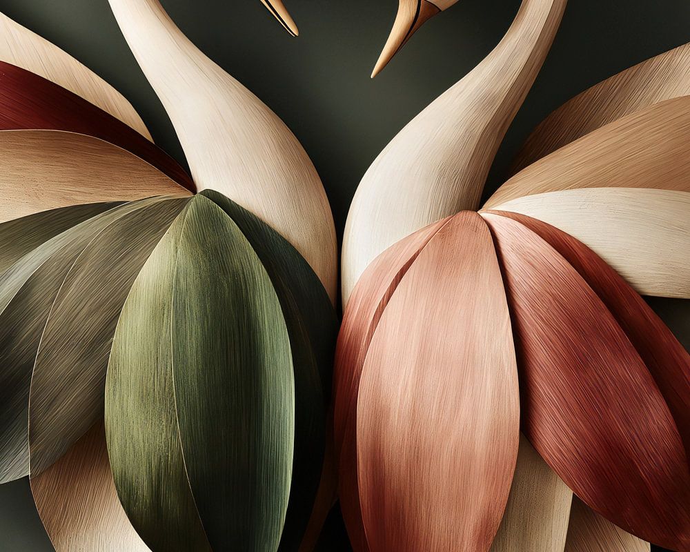 Abstract, imaginative portrait of two graceful swans, carved from wood in muted earth tones