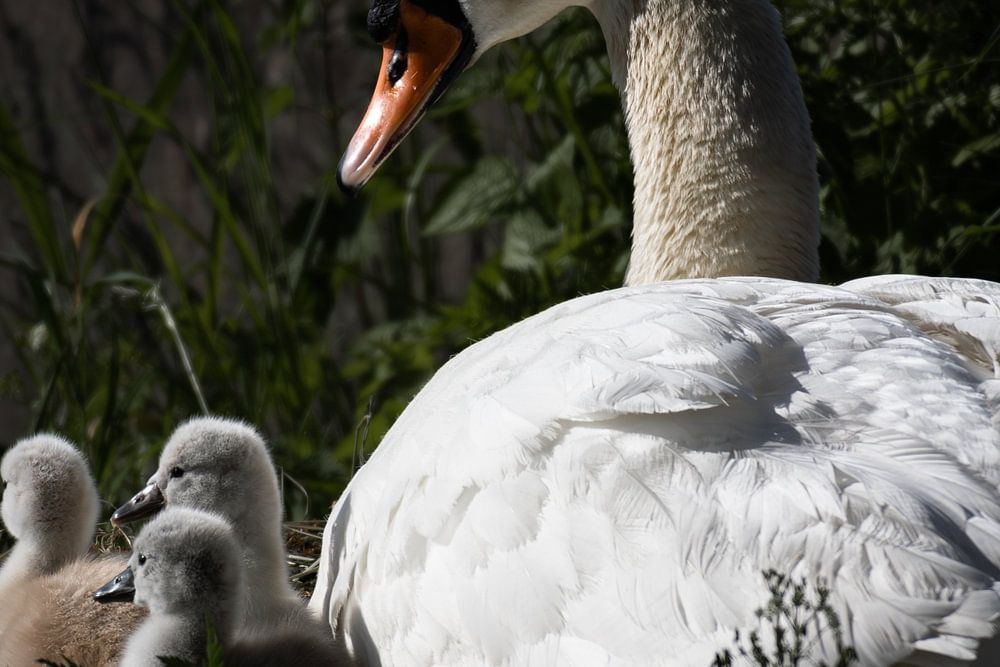 I came across this swan on the side of the road with a bank. At first, I saw just a couple of swans. But as I got closer, I saw that there were 3 youngsters with the swan (still fairly young). The father swan (I thought) stayed on guard, and remained calm as I got closer and closer to take a nice photo.