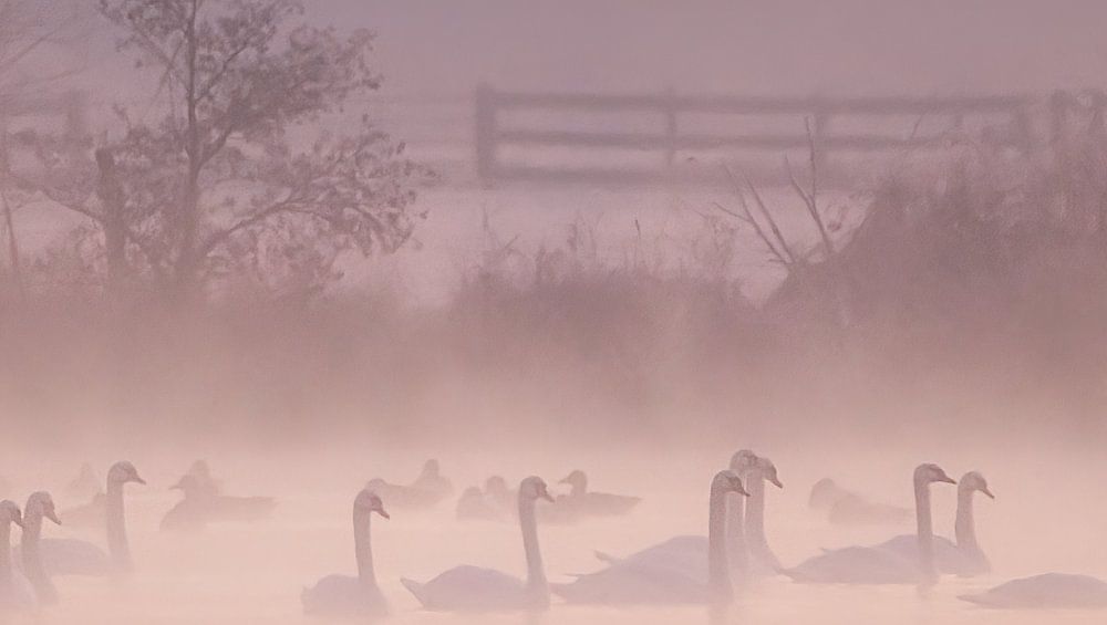 Buy the photo Swans in the fog by natascha verbij on canvas, ArtFrame, poster and wallpaper, printed on demand in high quality.
