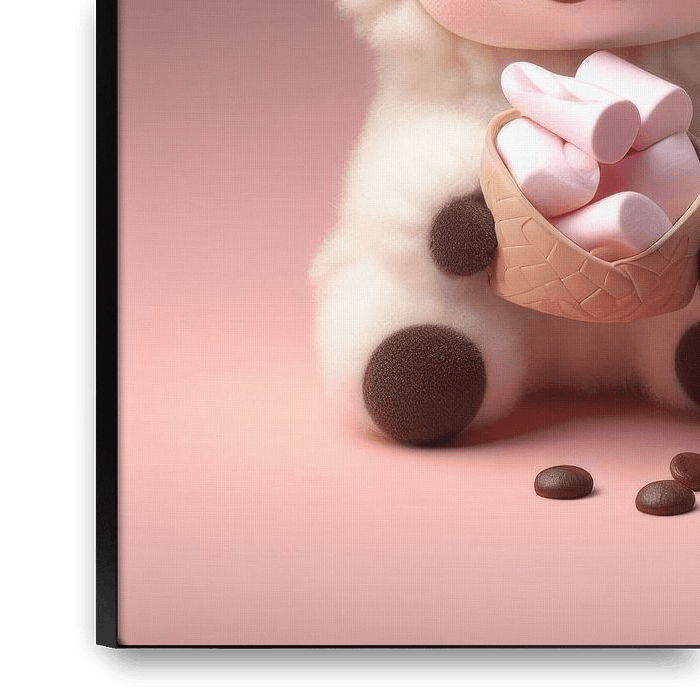 A charming, fluffy white lamb sits beside a steaming mug of hot cocoa topped with marshmallows. The lamb holds its own miniature cone of pink marshmallows, its big eyes sparkling with delight. The mug features a fuzzy brown heart, adding to the cozy and heartwarming atmosphere. Scattered coffee beans complete the scene, hinting at the…