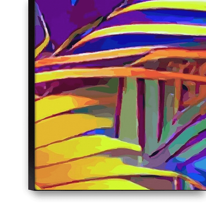 Swirling palm leaves in pop art colours: red, orange, purple, blue, yellow and green. Fresh from the rainforest. Bring the sunny lush jungle into your home. Digital art. Version: landscape.
