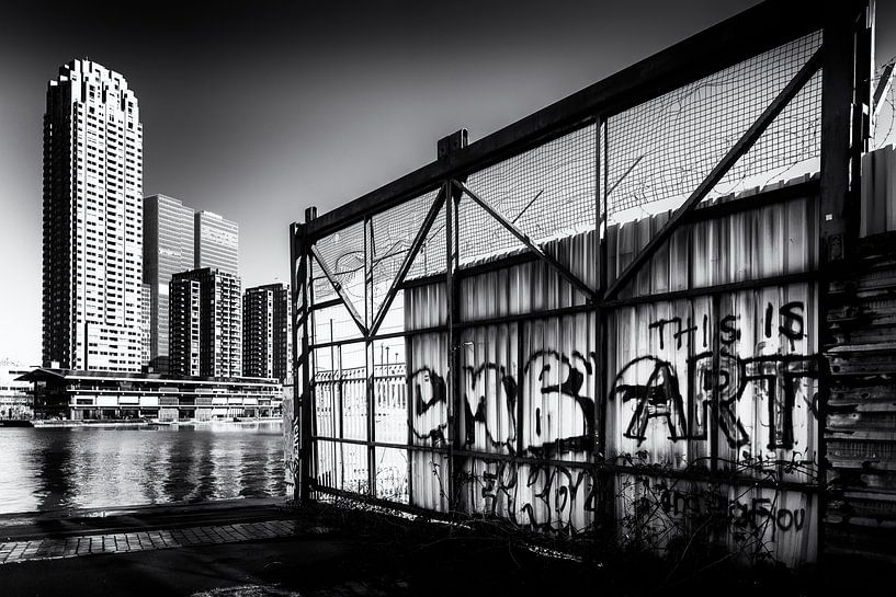 This photograph exudes the industrial spirit of Rotterdam, where the raw energy of the city blends with an unexpected layer of human expression. The contrasts are sharp: the rigid geometry of Rotterdam's Montevideo Tower, symbol of modern ambition, versus the weathered, graffiti-covered fence that serves as a canvas for anonymous voices…