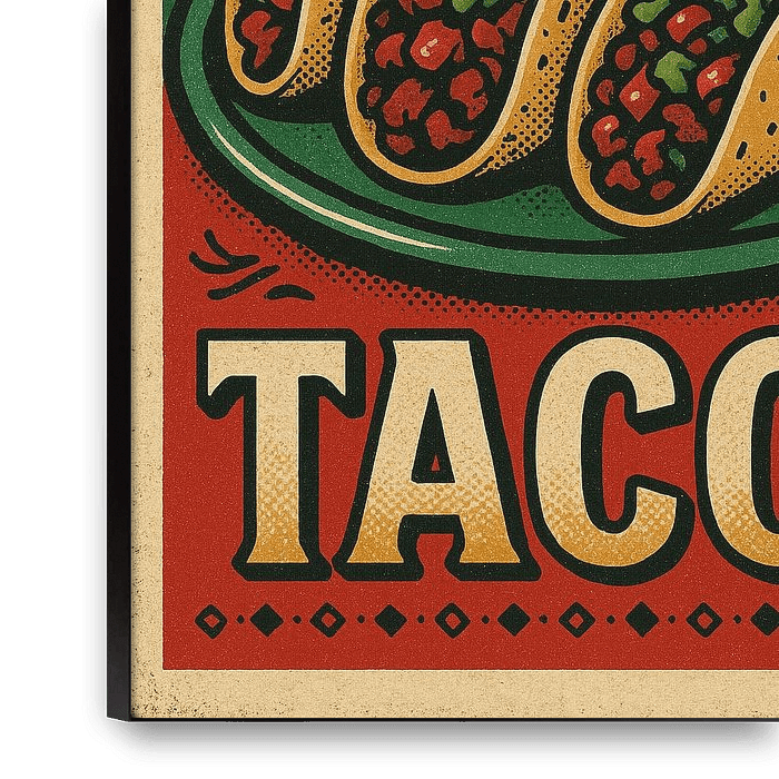 Few dishes represent Mexico’s spirit like the taco—and this Tacos poster pays homage to its irresistible charm in vivid pop-art style. Bursting with energy, it depicts warm tortillas filled with colorful ingredients, framed by lively papel picado banners, chili peppers, and radiant suns. The vintage texture and bold typography recall…