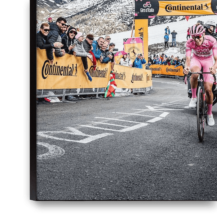 Tadaj Pogacar rides to victory in Livigno in the pink jersey. Two stunt skiers jump over him as he passes the rag in the final kilometre.