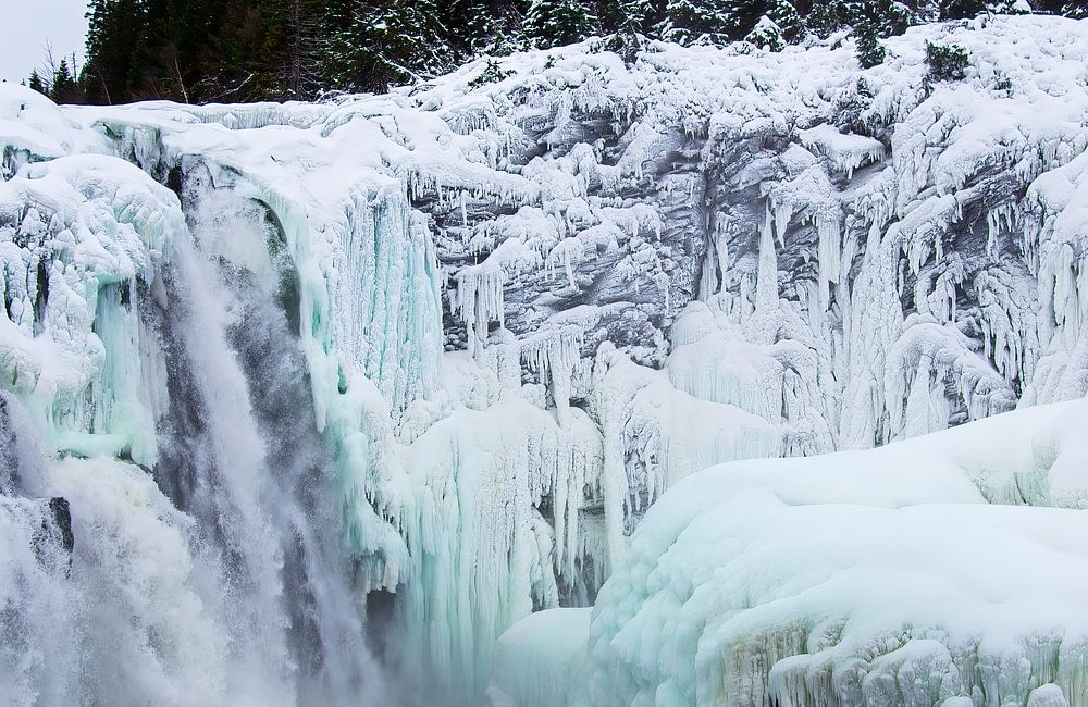 Tannforsen, the majestic waterfall in winter, frozen and powerful in its stillness. The water cascades down, but the ice grips the perimeter, partially silencing the waterfall into a winter wonderland. The cold has turned the water into icy sculptures, while the surrounding trees bear their branches as silent witnesses to the frozen splendour. The air is heavy with winter chill, and the current under the ice is just a whisper in the silence of the snow-covered landscape. Tannforsen remains an impressive picture of nature, showing its power both in motion and at rest.