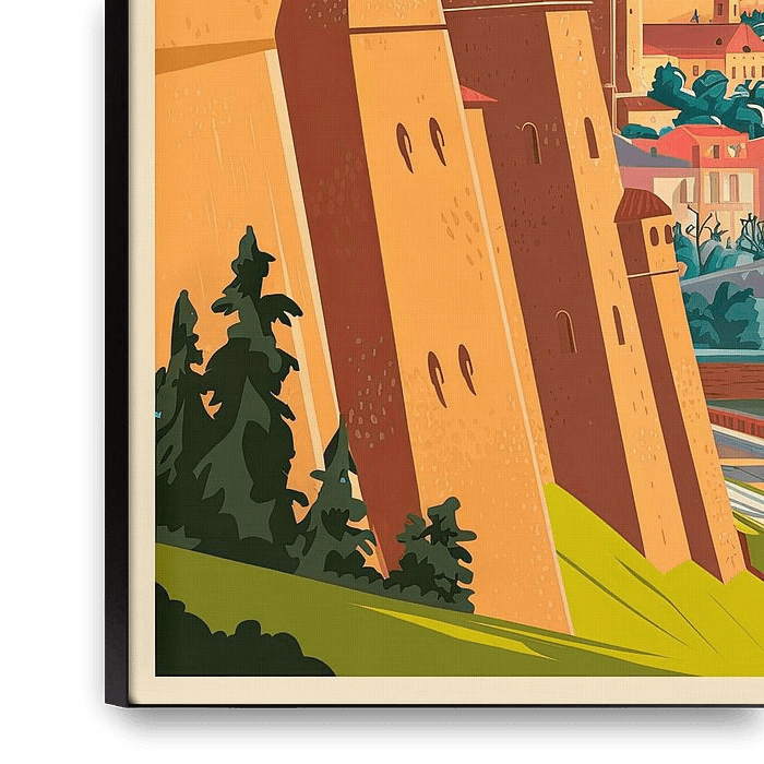 A colourful panorama transports you to the charming city of Tbilisi, where majestic towers tower over the rolling hills. The warm earth tones of the historic architecture harmonise with the bright blue sky, while the hustle and bustle of the city comes to life on the right. This artistic tribute reflects the rich culture and history of…