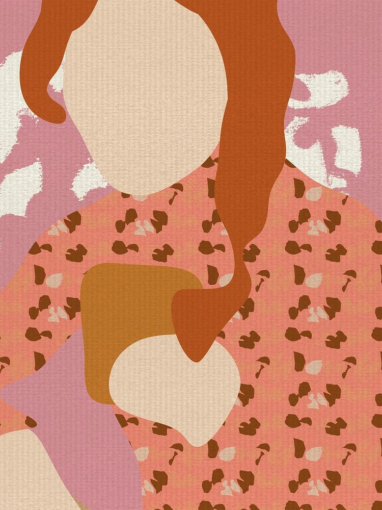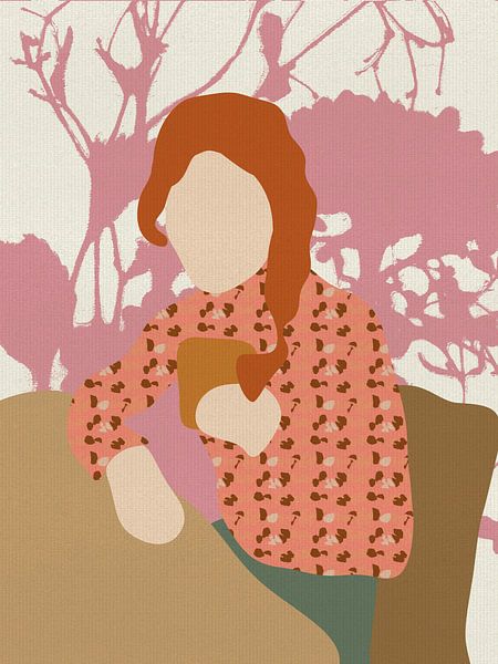 This minimalist collage shows a quiet, intimate moment: a girl seated at a table, holding a cup of tea or coffee, captured in a calm and reflective pose. The figure is simplified into clean shapes and clear contours, keeping the focus on mood rather than detail. She wears a sweater with a retro floral pattern, adding warmth and a subtle…