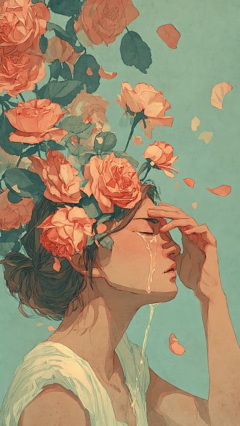 A surreal digital art illustration of a woman crying, with her tears transforming into blooming roses emerging from her head. Painted in a soft muted vintage color palette with whimsical, painterly brush strokes, this stylized oil painting evokes deep emotions and dreamlike fantasy. Perfect for wall art, home decor, or as a unique…