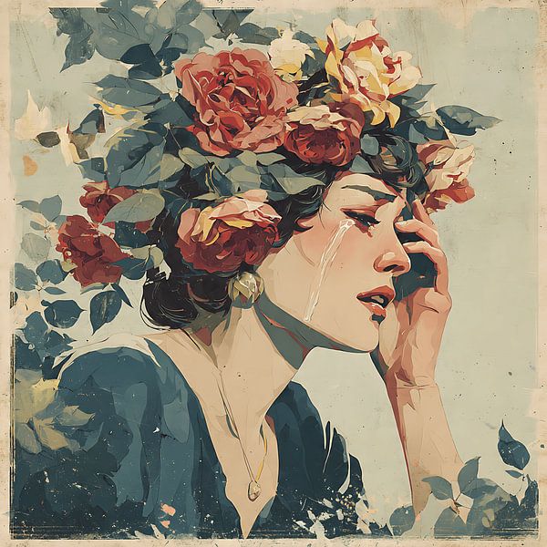 A surreal digital art illustration of a woman crying, with her tears turning into blooming roses from her head. Painted in an oil painting style with painterly brush strokes, soft muted vintage colors, and whimsical stylized design. Perfect for dreamlike wall art and surreal decor enthusiasts.