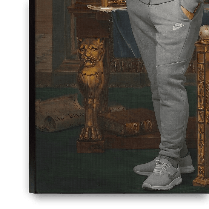 Napoleon Bonaparte, once the most powerful man in Europe, stands here in a grey tracksuit in his imperial study. This digital artwork is based on the famous portrait by Jacques-Louis David from 1812, in which Napoleon poses at his desk in the Tuileries. The original military uniform has been replaced by a comfortable hoodie-and-trousers…