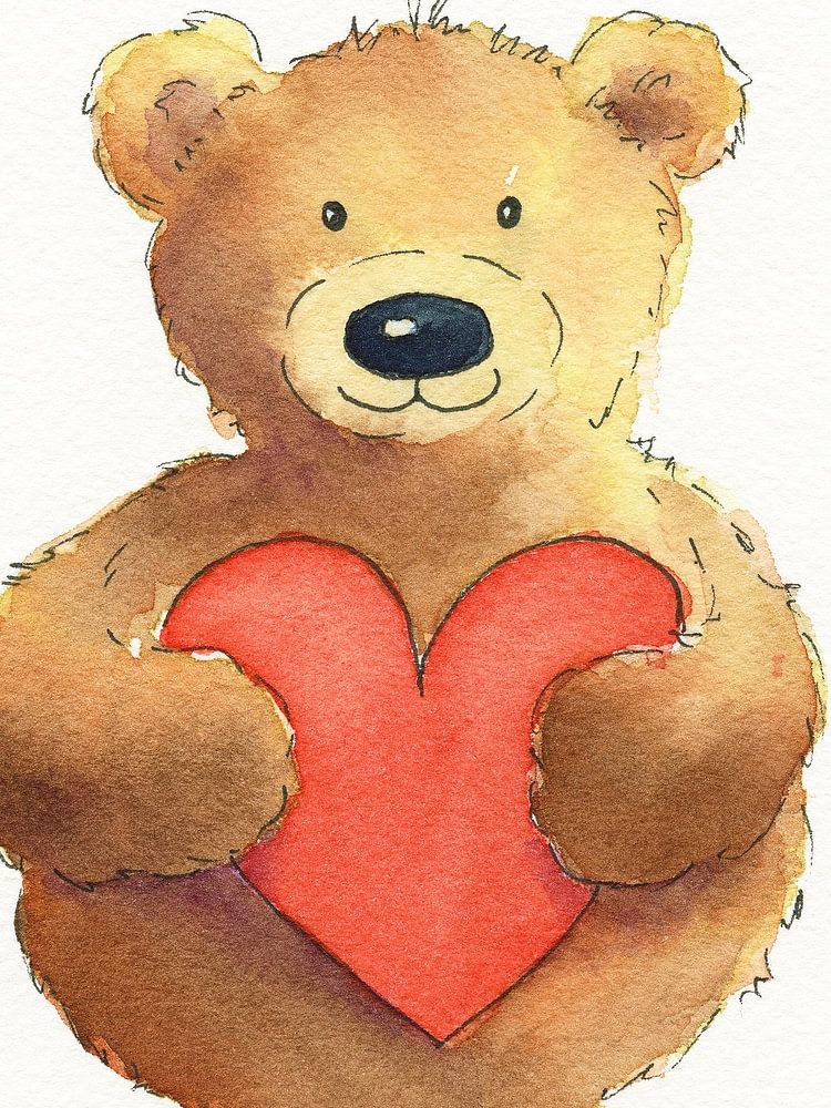 Teddy bear holding red heart is a hand-painted watercolour painting in portrait format by artist Karen Kaspar.