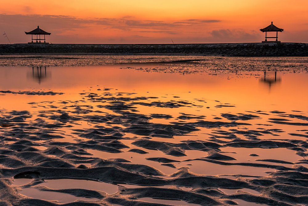 This picture was taken in the morning before sunrise in Bali Sanur directly on the beach. View of the sea towards sunrise with 2 temples in the water as breakwaters. Reflection of the purple sky and the pink clouds in the calm water