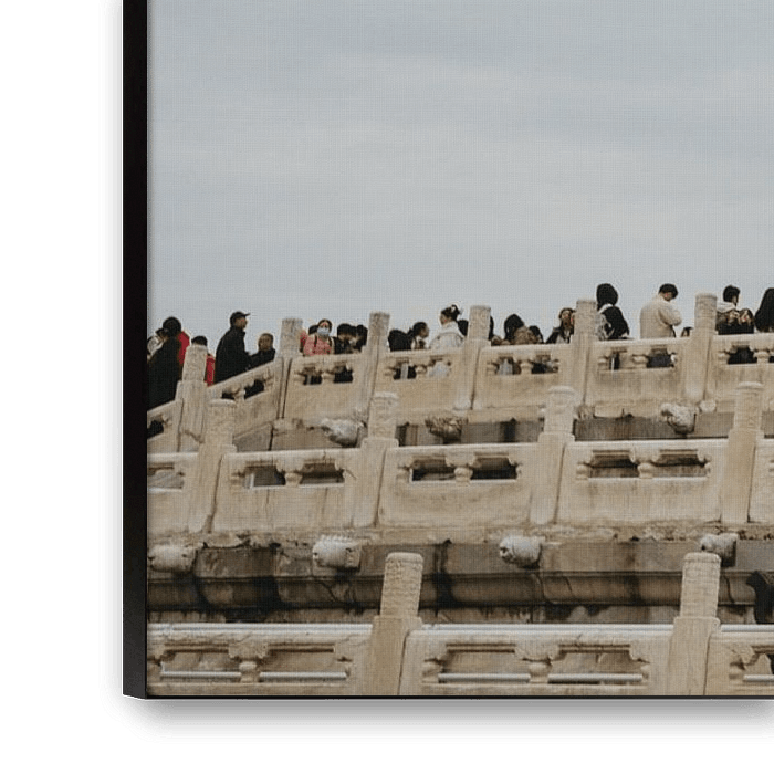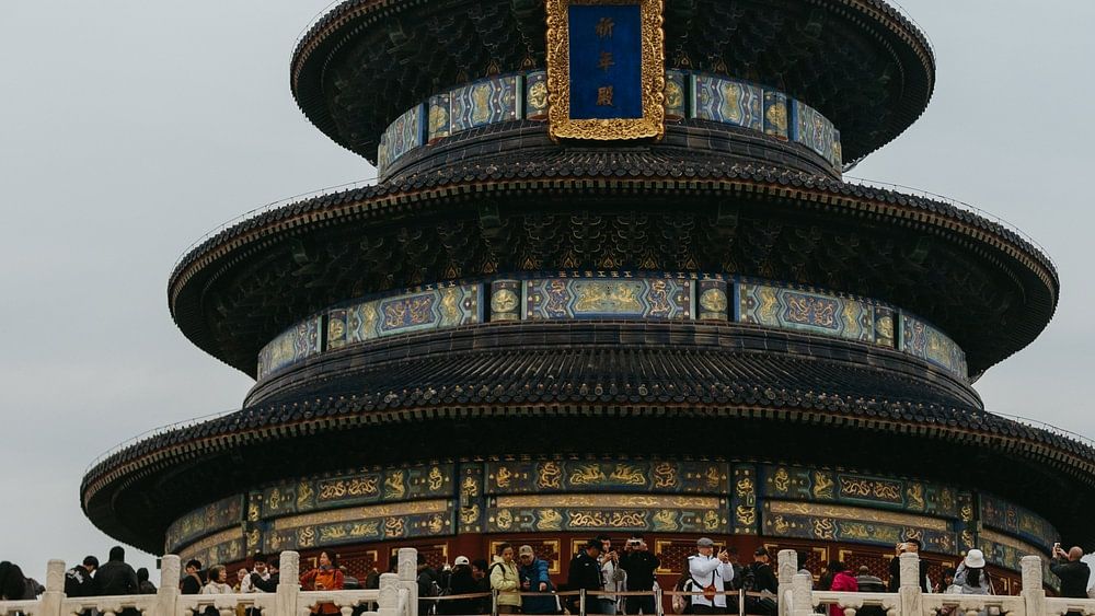 This picture focuses on the Hall of Good Harvest, the iconic circular main building of the Temple of Heaven. Its traditional blue-gold roof tiles and sophisticated patterns stand out powerfully against the soft, grey sky. Visitors move along the marble staircases and balustrades, highlighting the scale and historical weight of this imperial ritual complex.