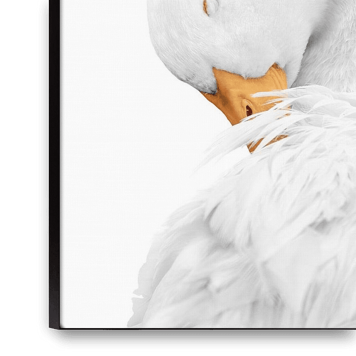 This beautiful image captures an intimate moment of a white goose grooming itself, its soft feathers and closed eyes exuding a sense of calm and introspection. The vibrant orange colour of the beak contrasts subtly with the pure white feathers, giving the composition a timeless elegance. The minimalist design with a plain background…