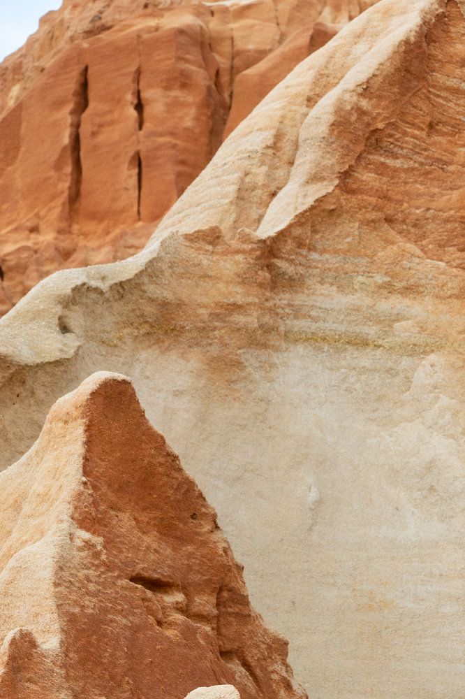 Praia da Falesia, I'm in love! This image has an almost graphic character, with naturally shaped pointed planes and shadows that blend in from warm terracotta tones to soft sand colours. The layering of rocks gives the image rhythm, and the blue sky with clouds provides freshness and breathing space.