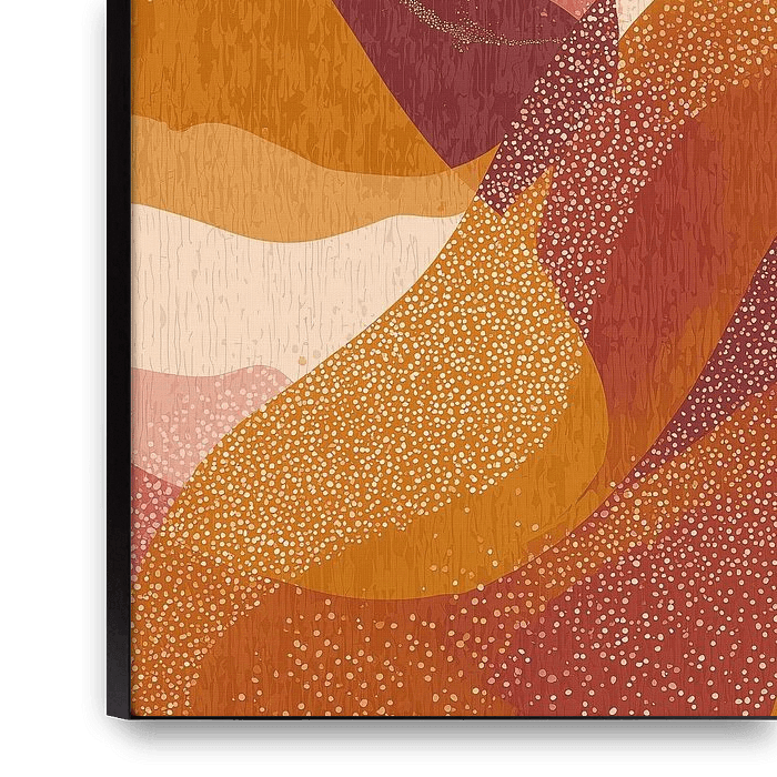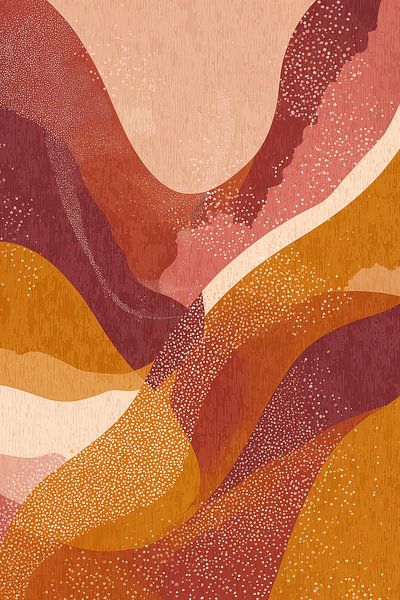 This mesmerizing artwork plays with flowing organic forms in a warm palette of terracotta, ochre, and burgundy. The stylized lines and subtle dot structures create depth and movement, while the perpetual transition between colors exudes a sense of tranquil transformation. Perfect for those who want to combine minimalist elegance with…