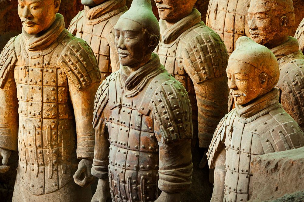 Close up of some statues in the famous Terracotta army in Xi'An. On the photo there are about 3 rows of soldiers.