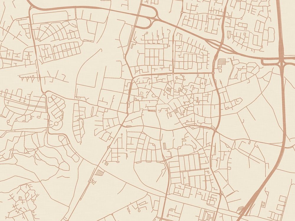 Explore Oosterhout with this Terracotta Style Map. The roads are colored in a dark coral shade that sits on the border between orange and brown. With a background in a creamy beige color, this map seamlessly fits into warm interiors that heavily incorporate pastel and beige tones. Combined with a subtle linen texture, this map adds a touch of refinement and tranquility to any space where it is displayed.