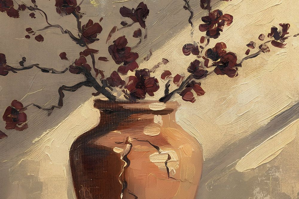 A painting of a terracotta vase containing branches with reddish-brown flowers. A golden yellow beige background. Warm artwork with lots of texture and rich details.