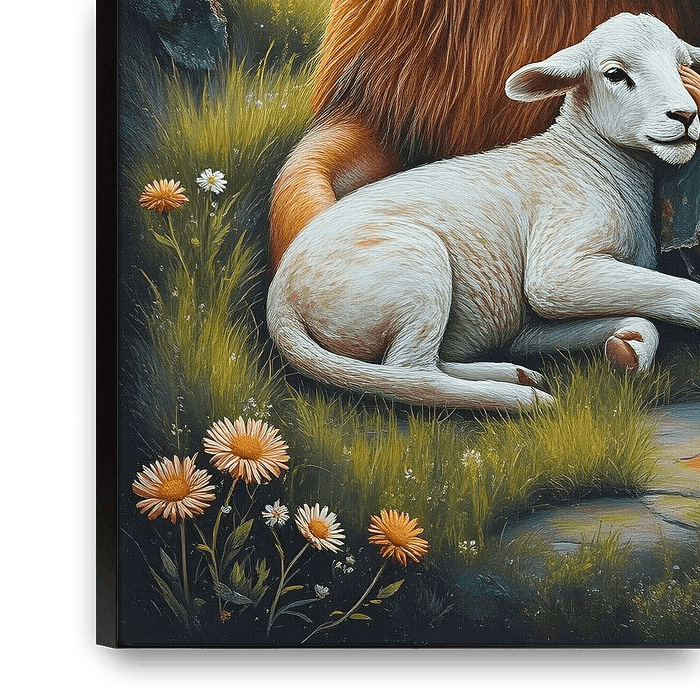 Imagine a world where harmony and love set the tone. Where animals and humans live together in perfect peace. This unique image captures that wonderful moment: a lion lying quietly and lovingly next to a lamb, while a child gently strokes the lamb. The scene radiates warmth, security and happiness - as if you yourself have a glimpse of…
