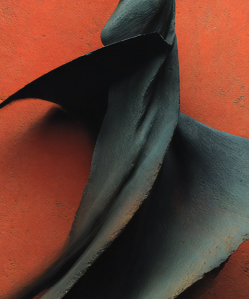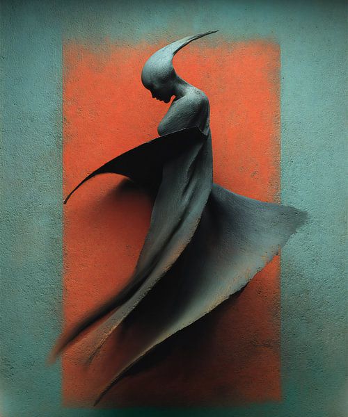 Abstract iron sculpture of an alien woman. Conceptual fantasy art in mainly green and orange tones.