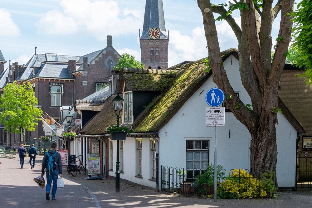 The Laanstraat in Baarn with the thatched roofs, town hall and Paulus church in spring.