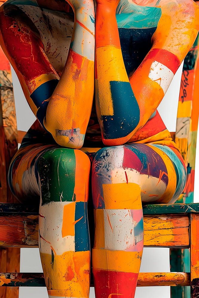 An artwork of a woman on a colourful wooden chair, her body covered in striking abstract patterns of paint, her head resting on her hands with a contemplative expression where her colourful face contrasts with the plain white background. The chair is also painted in striking abstract patterns of paint, enhancing the vivid artistic theme…
