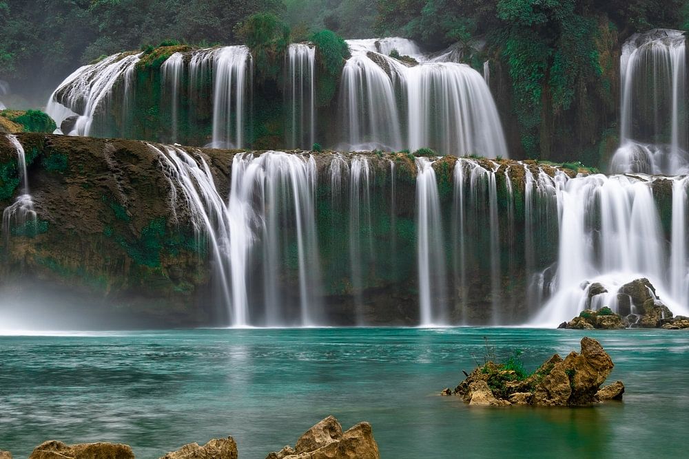 Ban Gioc waterfall is the largest and most beautiful waterfall in Vietnam, located in the northeastern province of Cao Bang. The water cascades down over three levels and is 30 metres high and 300 metres wide, making Ban Gioc the widest (but not the highest) waterfall in the country. The falls arise from the Quay Son River, a beautiful jade-blue body of water flowing from China through an amazing landscape of rice fields and limestone cliffs. The falls are little visited by tourists because they are so remote. Ban Gioc waterfall empties into the Quay Son River amidst a mountain range. From its height of 30 metres, the thundering water currents give you a mighty feeling. Ban Gioc is considered the most impressive and beautiful waterfall in Southeast Asia.