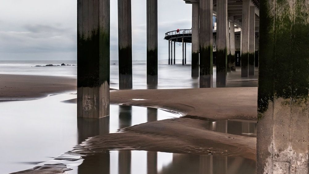 The photo was taken from under the pier with a view through to the North Sea. The round shape of the main building in the sea corresponds to the round pools in the sand around the pillars of the bridge.