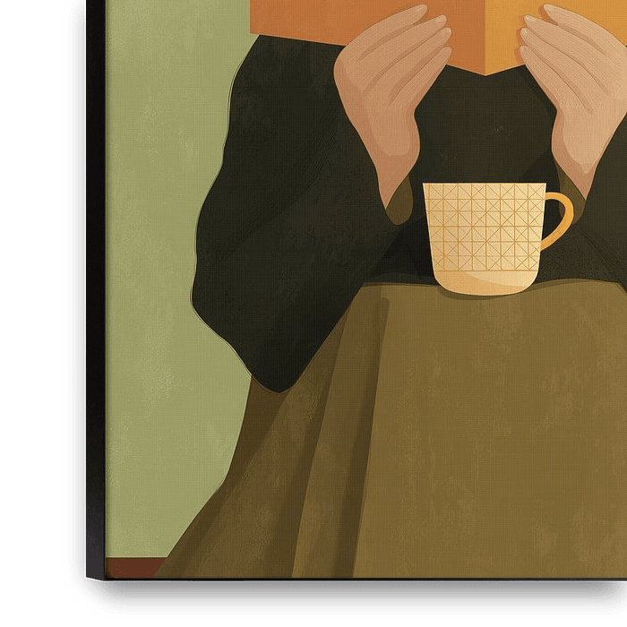 Completely absorbed by the words, the reader disappears behind her book. With a cup of tea within reach and the world on hold, she embodies the ultimate bookworm: content, unapproachable and slightly addicted to stories.