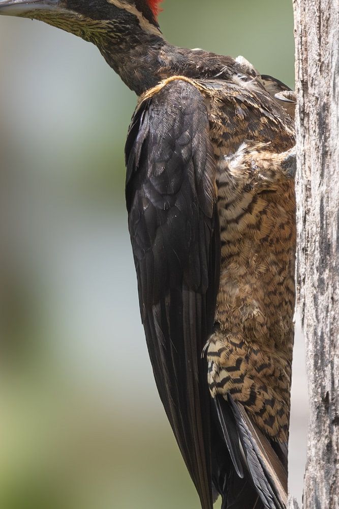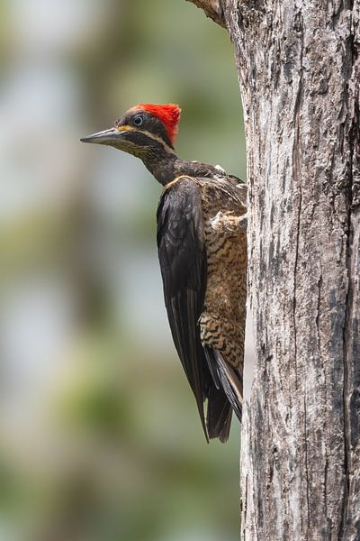 A hidden treasure in the Surinamese forest. This Striped Helmeted Woodpecker is a master of camouflage, but its striking ochre-yellow crest betrays its presence. The bird was captured in a characteristic pose against a weathered tree trunk in Bigi Pan. The fine, banded pattern of its plumage forms a beautifully graphic display of brown…