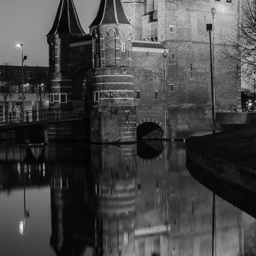 Reflections of the Amsterdamse Poort, the only remaining city gate in Haarlem