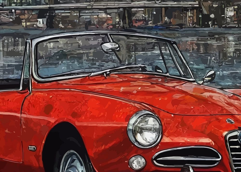 The classic 1955 Alfa Romeo Giulietta 1300 Spider in striking red radiates timeless elegance against a charming European cityscape, its sleek curves mirrored in the reflective ground. With a spirited 1.3L twin-cam engine and lightweight design, this convertible embodies the golden era of Italian motoring. Chrome details, delicate round headlights, and an open-top silhouette make it a true symbol of vintage sophistication and driving pleasure.