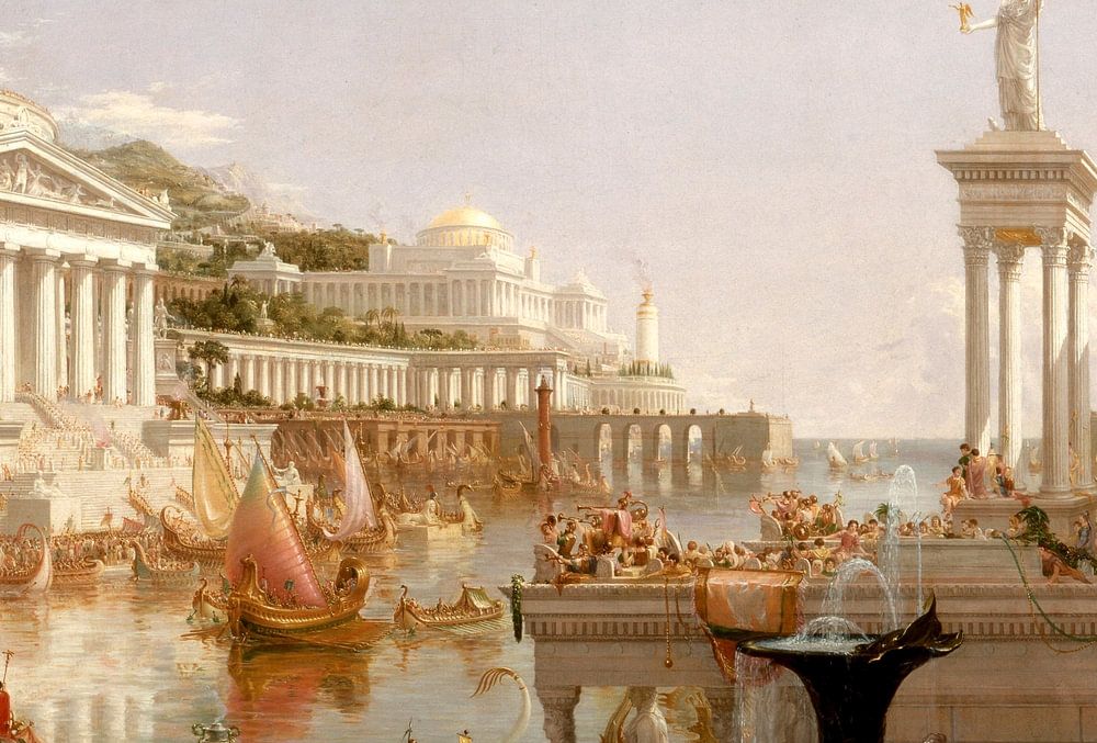 The third painting, The Consummation of Empire, shifts the viewpoint to the opposite shore, approximately the site of the clearing in the first painting. It is noontide of a glorious summer day. Both sides of the river valley are now covered in colonnaded marble structures, whose steps run down into the water. The megalithic temple seems to have been transformed into a huge domed structure dominating the river-bank. The mouth of the river is guarded by two pharoi, and ships with lateen sails go out to the sea beyond. A joyous crowd throngs the balconies and terraces as a scarlet-robed king or victorious general crosses a bridge connecting the two sides of the river in a triumphant procession. In the foreground an elaborate fountain gushes. The look of the painting suggests the height of ancient Rome. The decadence seen in every detail of this cityscape foreshadows the inevitable fall of this mighty civilization.
