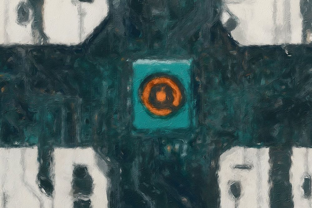 A dark cross cuts through a white space, with a fiery circle framed in turquoise at its core. It evokes the sacred symbol of the wind and serpent god Quetzalcoatl, the bringer of knowledge and life in Aztec tradition. The centre burns like the sun itself, a heart connecting the four directions of the world.