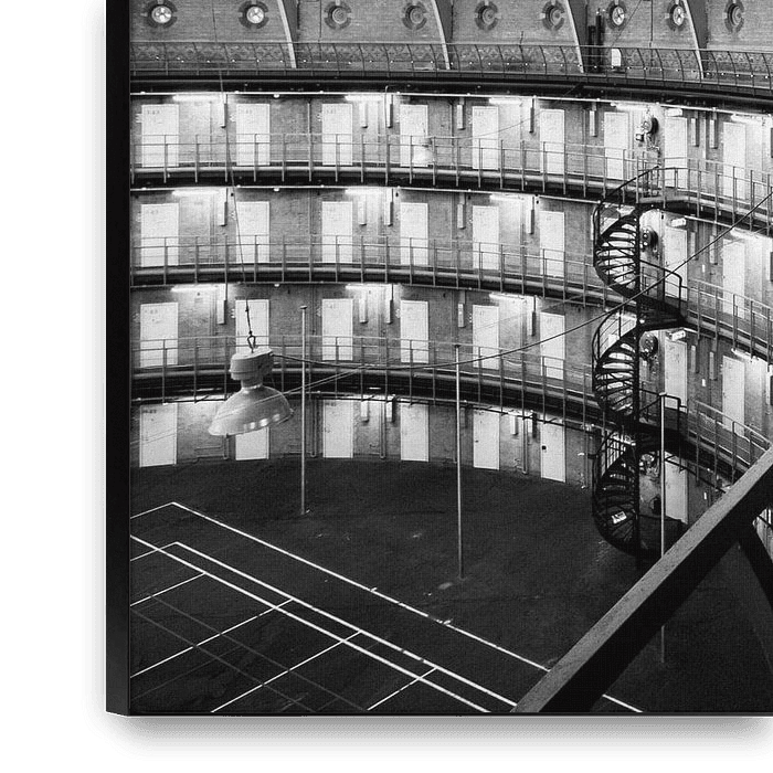 The monumental interior of De Koepel prison Haarlem in black and white.